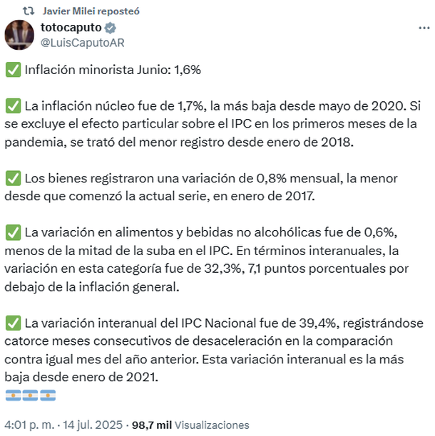 El ministro de Economía también se expresó en redes sociales y escribió: “Inflación minorista Junio: 1,6%. La inflación núcleo fue de 1,7%, la más baja desde mayo de 2020. Si se excluye el efecto particular sobre el IPC en los primeros meses de la pandemia, se trató del menor registro desde enero de 2018”, comenzó indicando, en un mensaje que fue republicado por Milei.