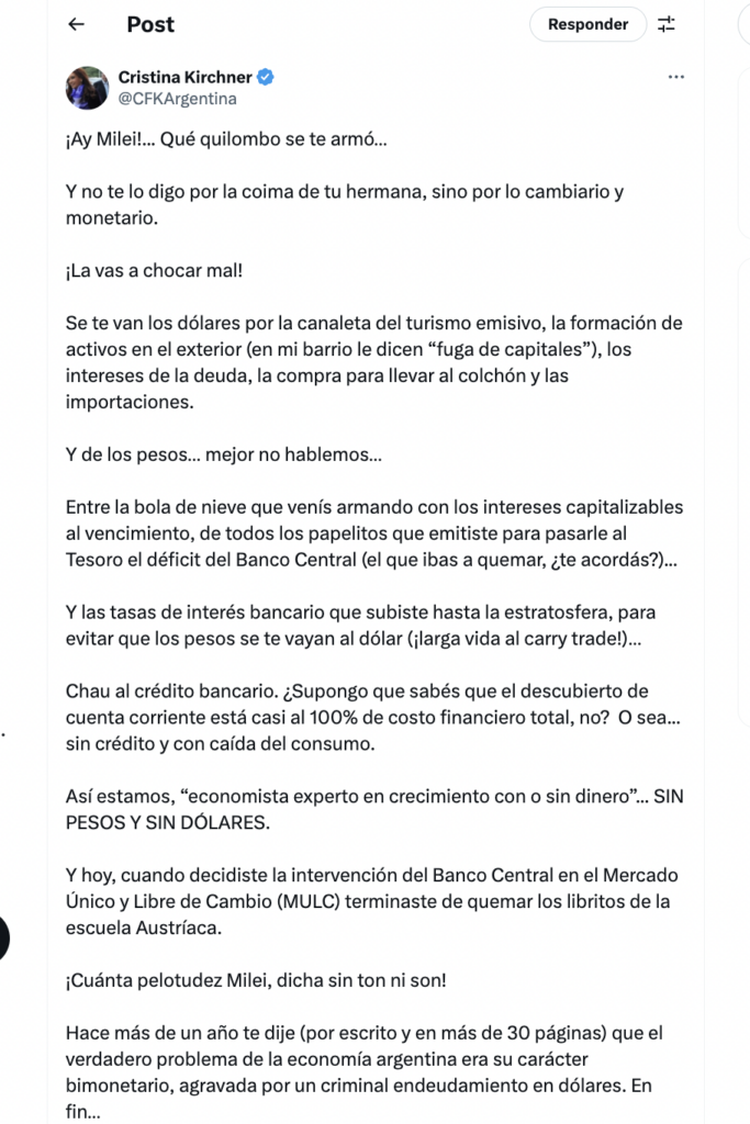 “¡Ay Milei!… Qué quilombo se te armó… Y no te lo digo por la coima de tu hermana, sino por lo cambiario y monetario. ¡La vas a chocar mal!”, señaló la exmandataria en el inicio de una extensa publicación.
