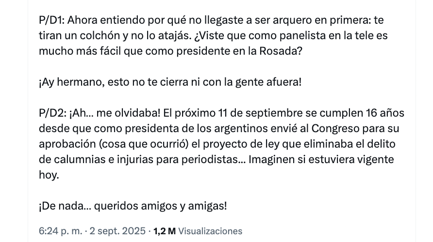 En medio del escándalo por presuntas coimas en la Agencia Nacional de Discapacidad (ANDIS) y la filtración de audios, y la reciente crisis del dólar que afecta al Gobierno, la expresidenta Cristina Kirchner lanzó este martes un contundente tuit contra el presidente Javier Milei, en donde le avisó que la “está chocando mal”.