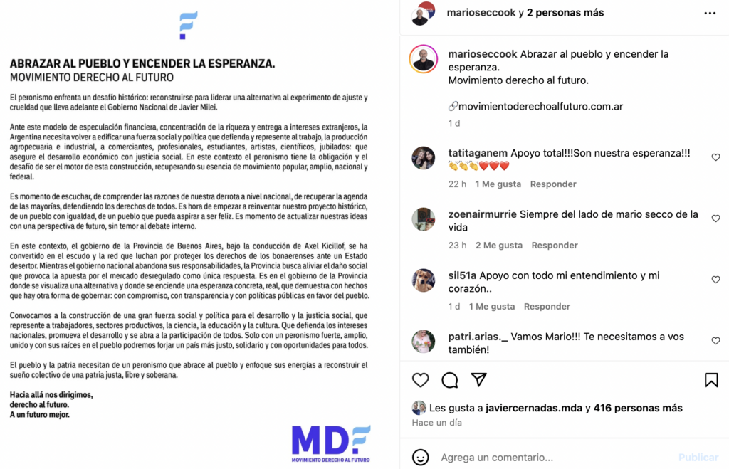 El intendente de Ensenada, Mario Secco, defendió en una entrevista radial, el lanzamiento del nuevo espacio kicillofista, llamado “Movimiento Derecho al Futuro” y marcó explícitamente su total apoyo al armado del gobernador bonaerense, Axel Kicillof.