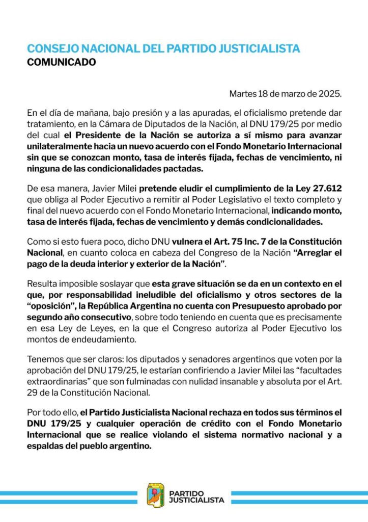 “Por todo ello, el Partido Justicialista Nacional rechaza en todos sus términos el DNU 179/25 y cualquier operación de crédito con el Fondo Monetario Internacional que se realice violando el sistema normativo nacional y a espaldas del pueblo argentino“, concluyeron.