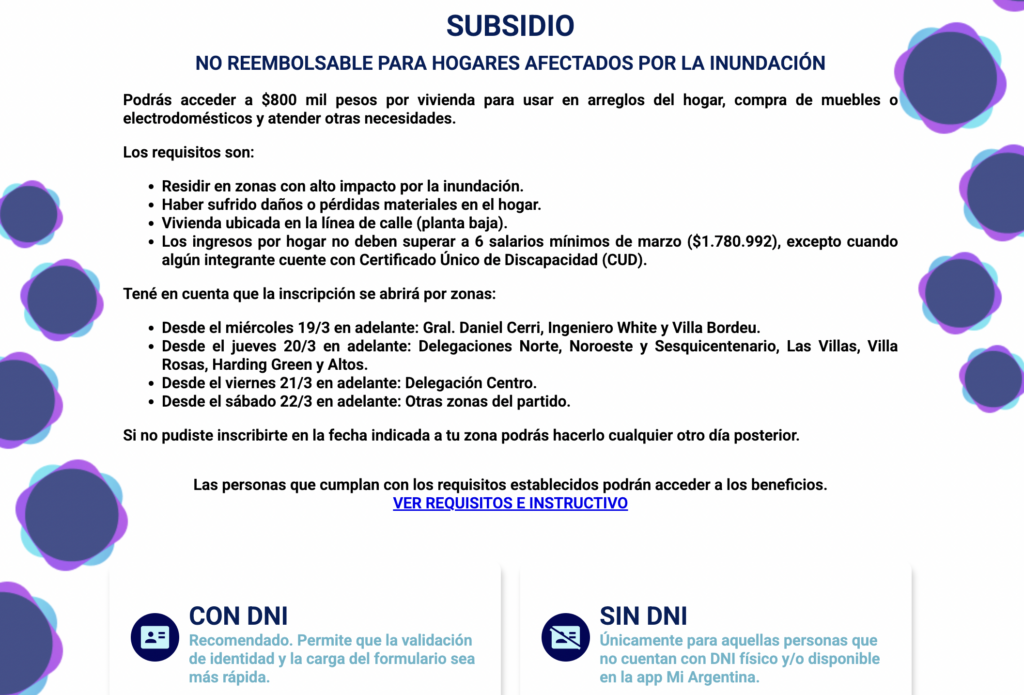 Se encuentra abierta la inscripción para el subsidio destinado por el Gobierno de la provincia de Buenos Aires a hogares afectados por la inundación en el partido de Bahía Blanca. Las y los afectados podrán acceder a $800 mil pesos por vivienda para que sean utilizados en arreglos del hogar, compra de muebles o electrodomésticos, como también para atender otras necesidades, y no será necesario hacer ninguna rendición al respecto.