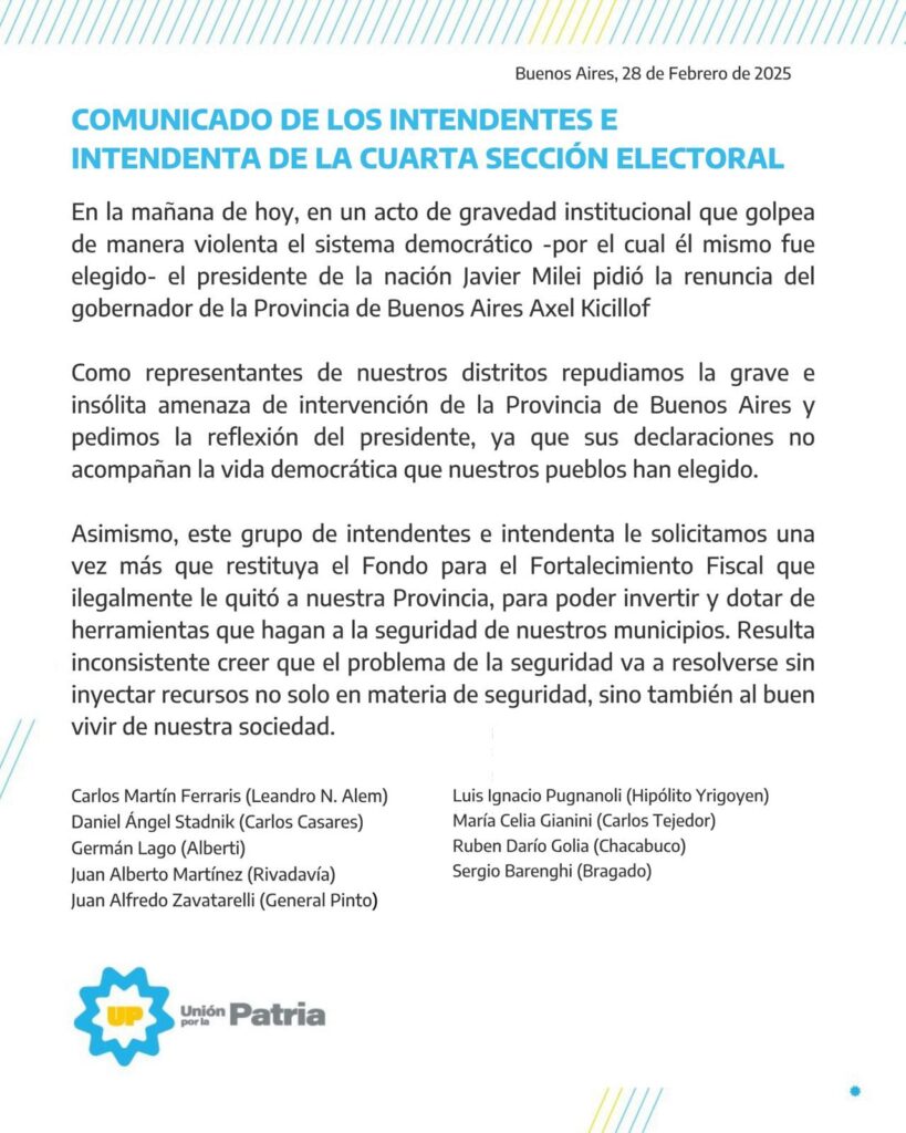 “En la mañana de hoy, en un acto de gravedad institucional que golpea de manera violenta el sistema democrático -por el cual él mismo fue elegido- el presidente de la nación Javier Milei pidió la renuncia del gobernador de la Provincia de Buenos Aires Axel Kicillof”, comienza el comunicado firmado por Carlos Martín Ferraris (Leandro N. Alem), Daniel Angel Stadnik (Carlos Casares), Germán Lago (Alberti), Juan Alberto Martínez (Rivadavía), Juan Alfredo Zavatarelli (General Pinto), Luis Ignacio Pugnaloni (Hipólito Yrigoyen), María Celia Gianini (Carlos Tejedor)Ruben Darío Golia (Chacabuco), Sergio Barenghi (Bragado).