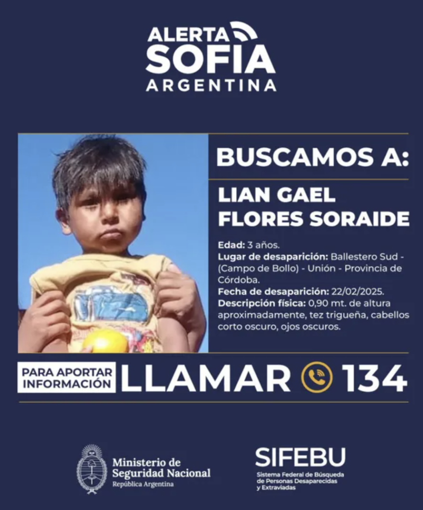 Este lunes continúa la intensa búsqueda para encontrar a Lian Gael Flores Soraide, el nene de 3 años que desapareció el sábado por la tarde en la localidad de Ballesteros Sud, cerca de la ciudad Bell Ville, en la provincia de Córdoba. Mientras se amplía la zona de rastrillaje, la Policía provincial requisó la vivienda de un hombre, donde secuestraron una camioneta y tres teléfonos celulares.