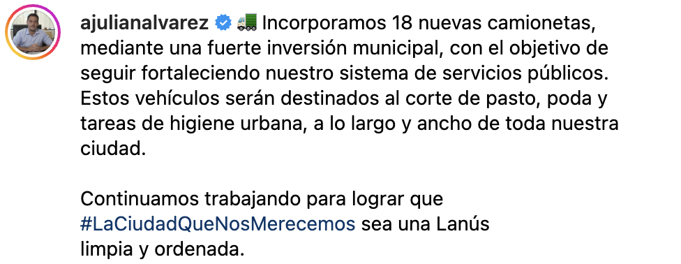 El intendente, Julián Álvarez, señaló que "esta nueva flota de camionetas estará destinada a corte de pasto, poda y tareas de higiene urbana, con el objetivo de seguir construyendo la ciudad que nos merecemos".