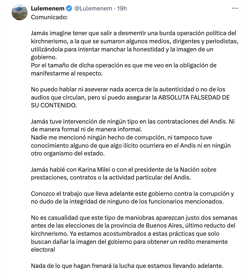 Si bien Menem no opinó sobre la autenticidad de las grabaciones, fue categórico sobre las acusaciones: “Si puedo asegurar la ABSOLUTA FALSEDAD DE SU CONTENIDO”, escribió en el comunicado difundido en sus redes sociales.
