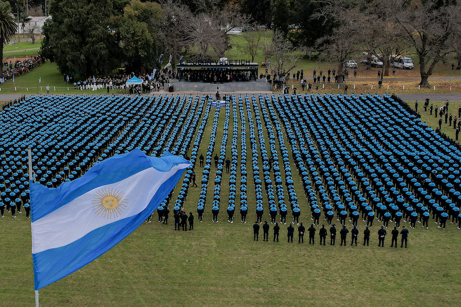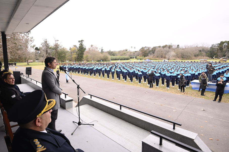 El gobernador de la provincia de Buenos Aires, Axel Kicillof, encabezó este lunes junto al ministro de Seguridad, Javier Alonso, el acto de jura de fidelidad a la bandera nacional de 2.736 cadetes que finalizarán este año el proceso de formación.