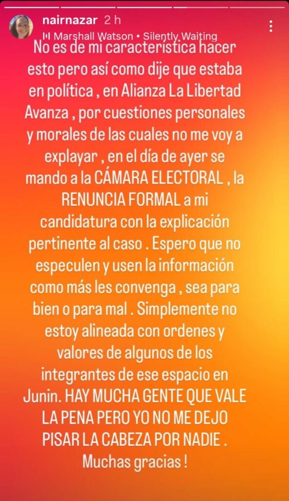 “Pedí hace más de un mes, el 27 de julio, pedí al coordinador que me elimine de la lista porque cuando nos hicieron firmar a último momento no nos dijo quiénes estaban. Cuando vi los nombres, apareció el nombre de una persona que conozco de la Universidad y no sé si se recibió de ingeniera agrónoma, que me llamó la atención porque nunca había visto defendiendo ideales de La Libertad Avanza ni estuvo presente en ninguna reunión (refiriéndose a la segunda candidata, Rocío Cayzak).