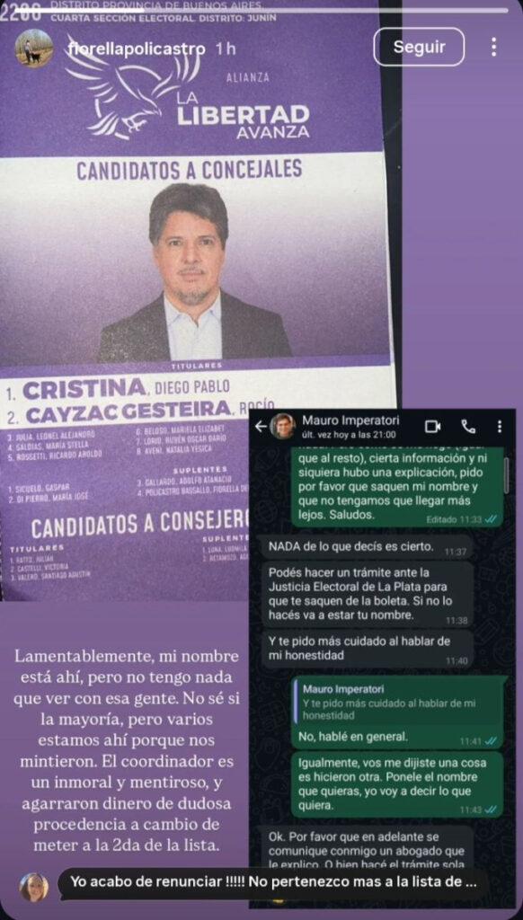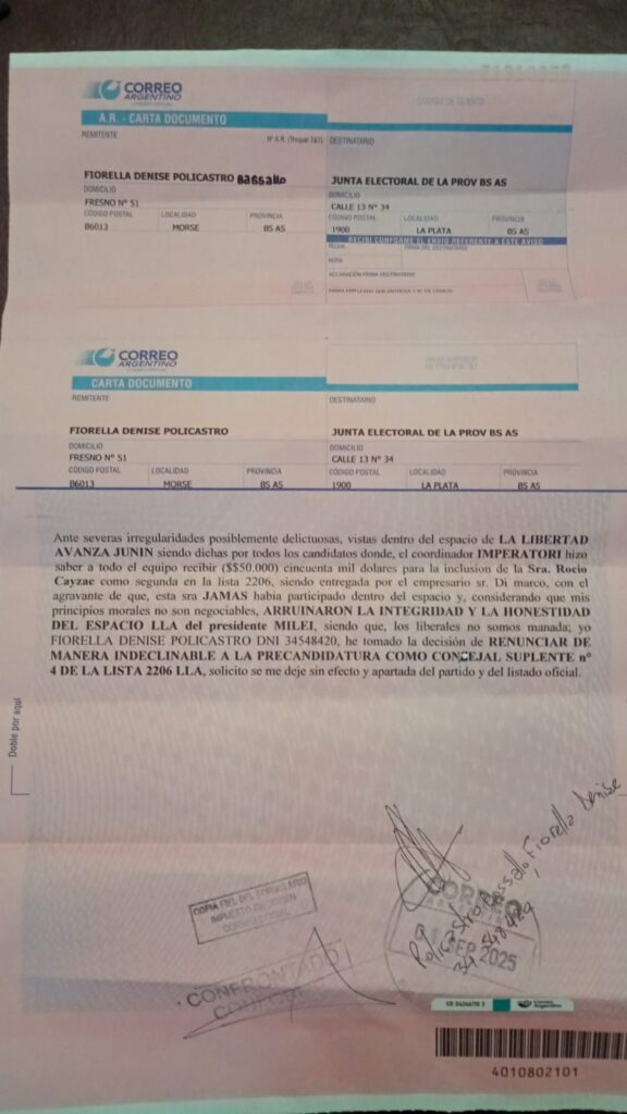 Después de la llegada del presidente a la ciudad bonaerense de Junín, estalló el escándalo cuando Fiorella Denise Policastro Bassallo quien ocupaba el cuarto lugar suplente de la lista de concejales de La Libertad Avanza Junín presentó la renuncia a su candidatura porque en la lista apareció una persona que según sus dichos “habría aportado 50 mil dólares para la campaña”.