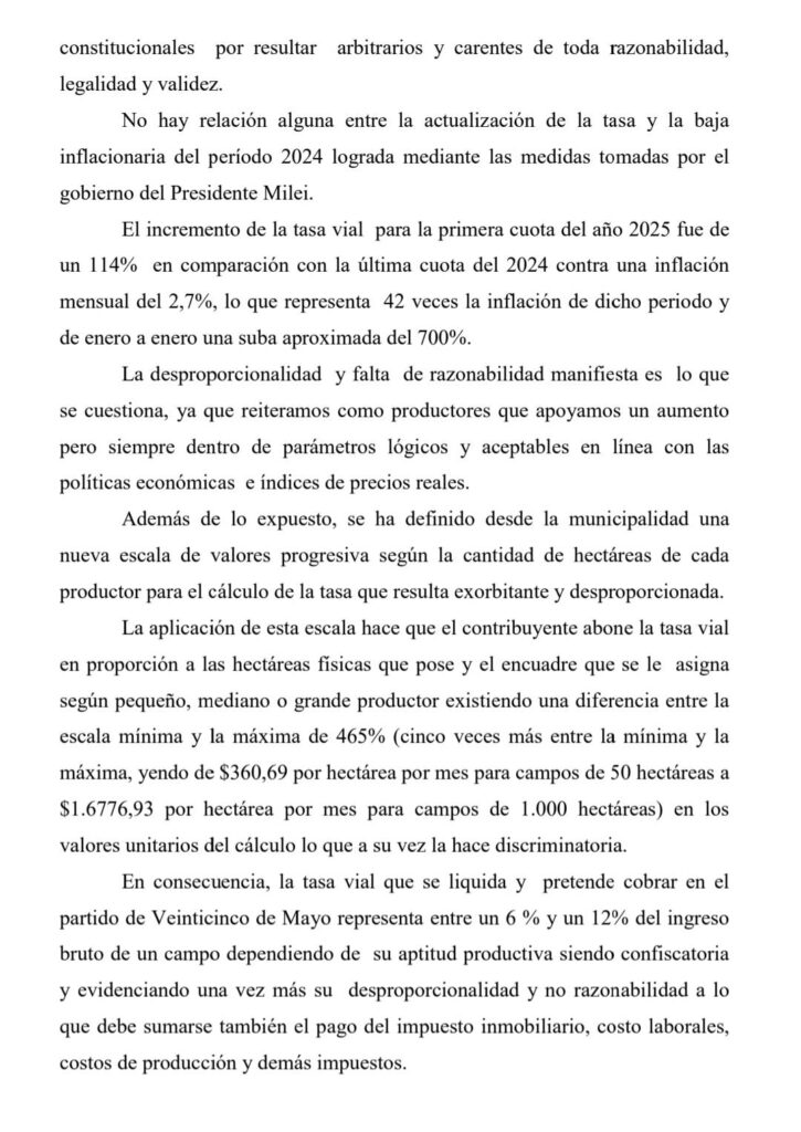 Por última indicaron que “la tasa vial que se liquida y pretende cobrar en el partido de 25 de Mayo representa entre un 6% y un 12% del ingreso bruto de un campo dependiendo de su aptitud productiva siendo confiscatoria y evidenciando una vez más su desproporcionalidad y no razonabilidad a lo que debe sumarse también el pago del impuesto inmobiliario, costos laborales, costos de producción y demás impuestos”.