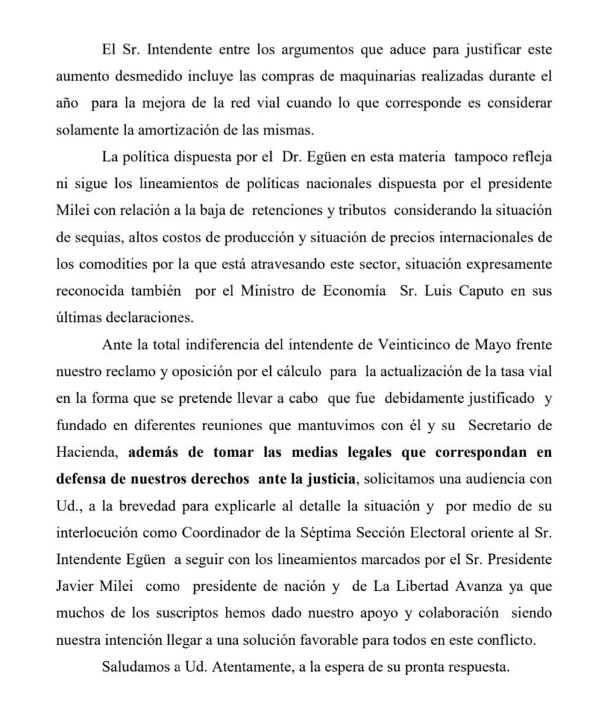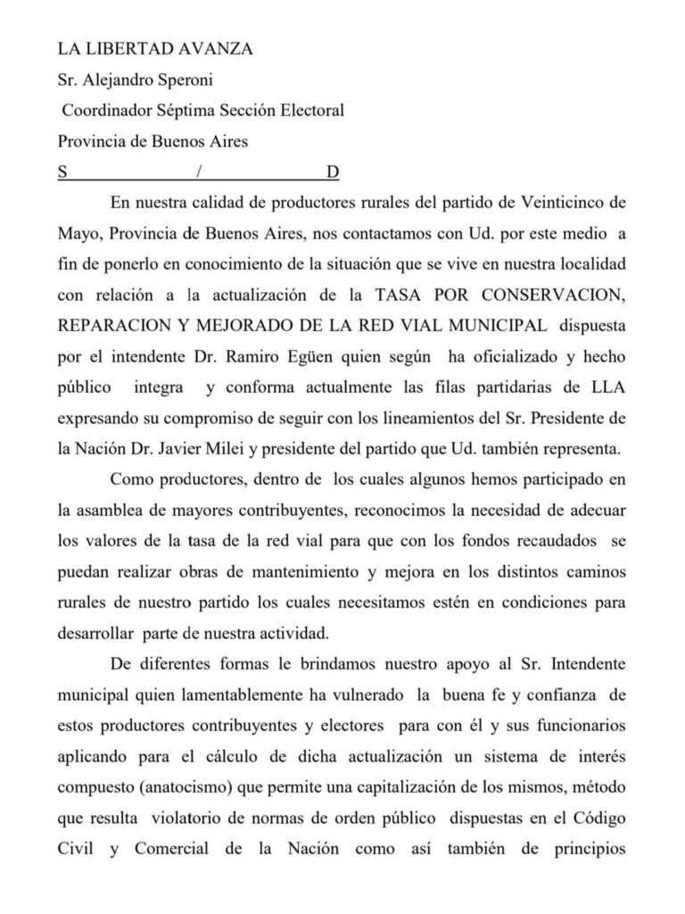 En las últimas horas un grupo de productores rurales de 25 de Mayo enviaron una nota al Coordinador de la Séptima Sección Electoral de La Libertad Avanza, Alejandro Speroni, para reclamar por el excesivo aumento en la Tasa por Conservación, reparación y mejorado de la red vial municipal “dispuesta por el Intendente Ramiro Egüen quien según ha oficializado y hecho público integra y conforma actualmente las filas partidarias de LLA expresando su compromiso de seguir con los lineamientos del Presidente de la Nación Dr. Javier Milei”.