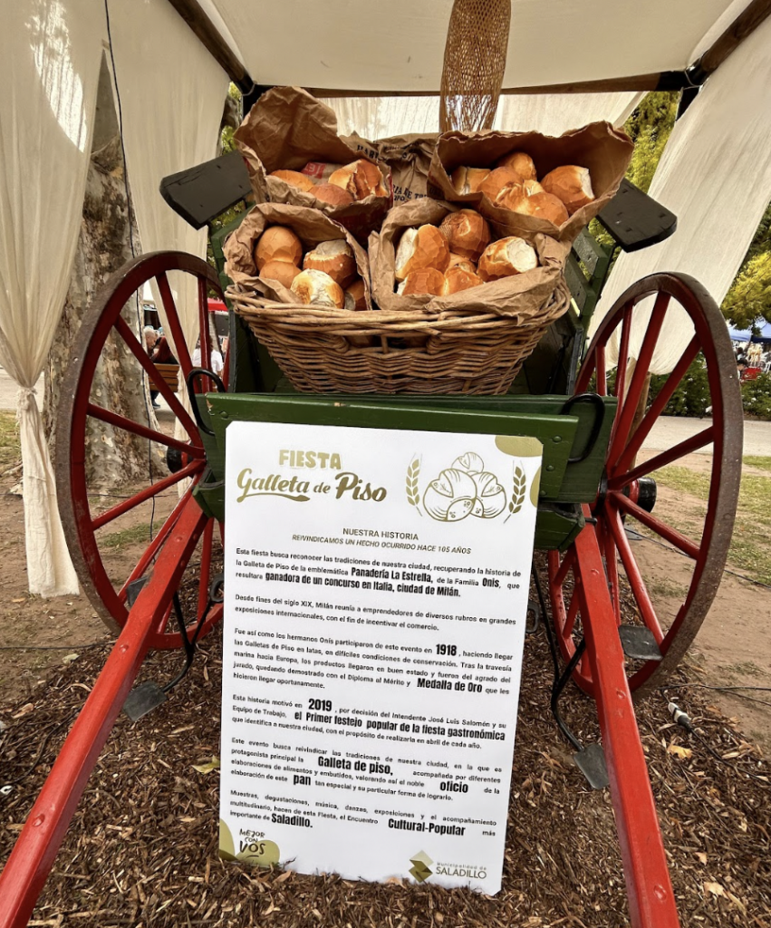 Redonda, la Galleta de Piso es el último pan que se tira en el horno. Nació en el mismo Saladillo que ahora la festeja, hace más de un siglo, cuando la familia Onis, cuya panadería La Estrella -fundada en 1912-, envió en 1918 una lata de galletas por barco hasta Milán, Italia, para participar de una competencia donde obtuvo el Primer Premio Mundial Medalla de Oro.