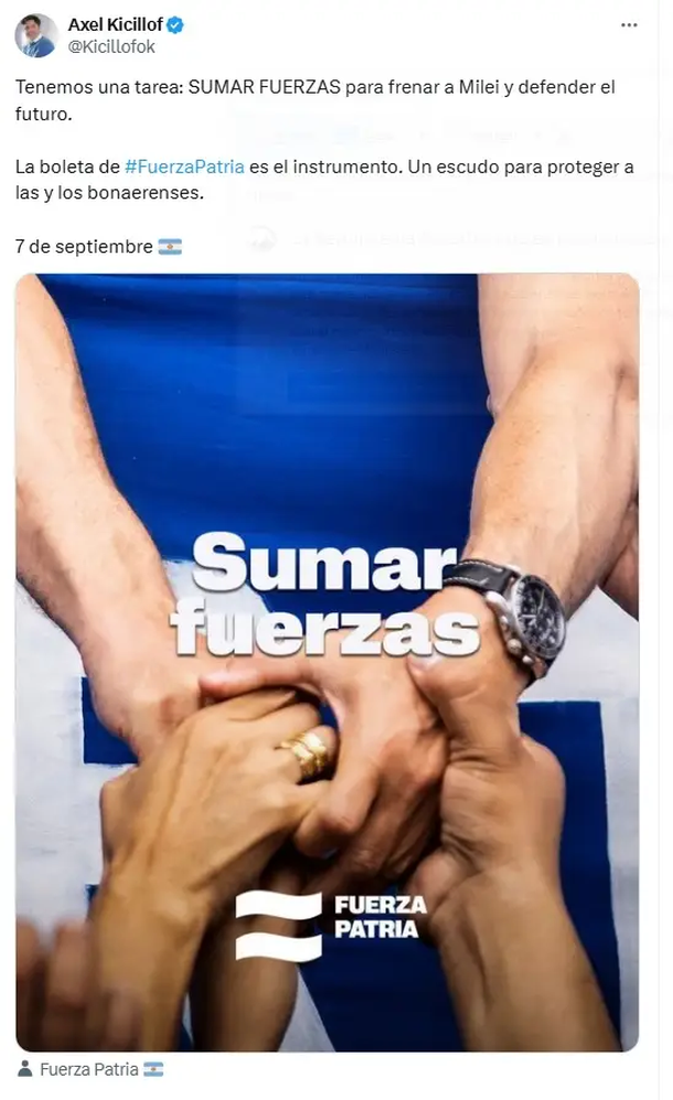 Con los candidatos ya definidos para competir en las ocho secciones electorales y los 135 municipios, intendentes, funcionarios y postulantes comenzaron a replicar el mensaje. “Tenemos una tarea: SUMAR FUERZAS para frenar a Milei y defender el futuro. La boleta de #FuerzaPatria es el instrumento. Un escudo para proteger a las y los bonaerenses”, reiteró Kicillof a través de su cuenta en X.